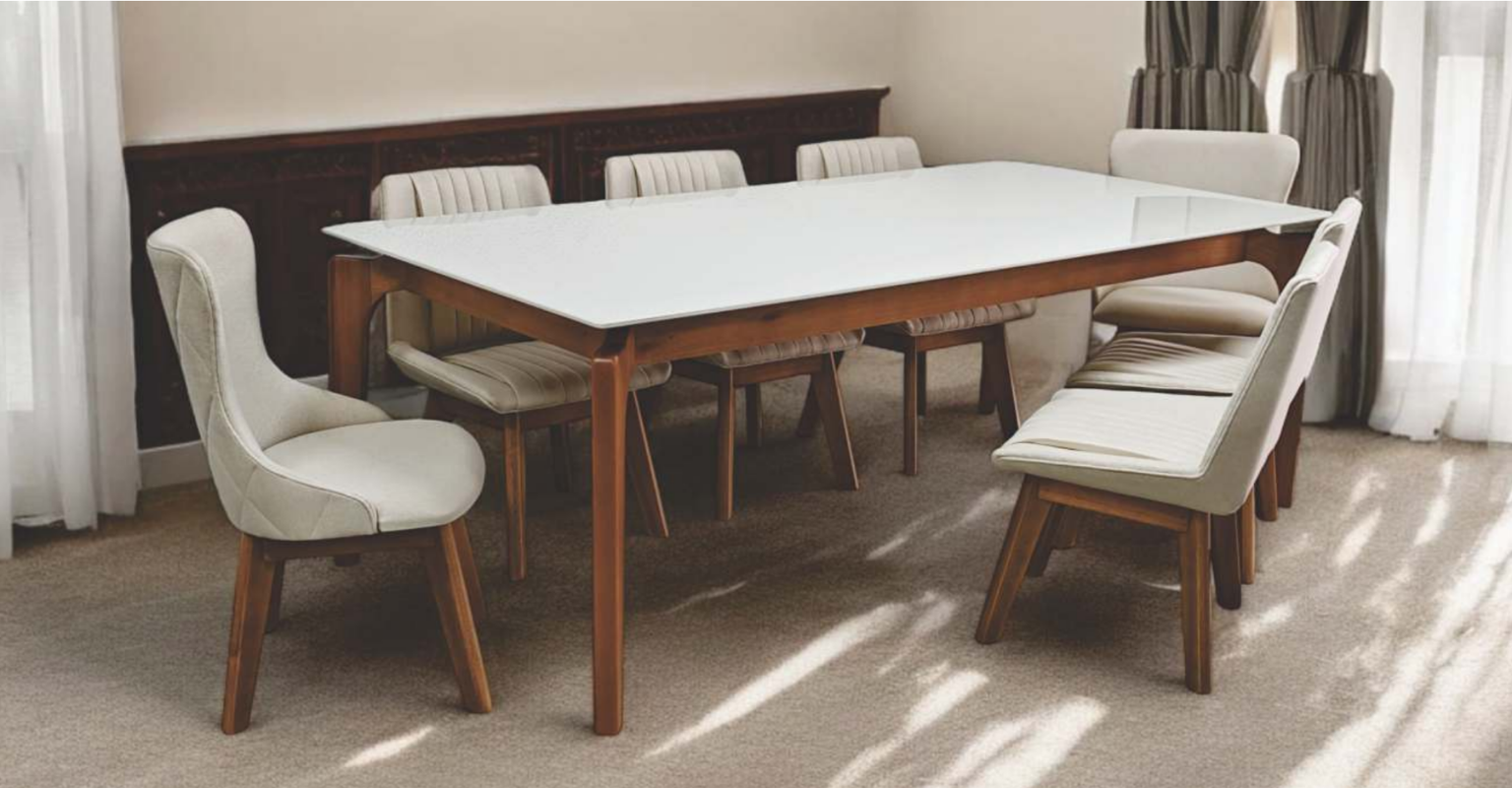 A Mesa Flora é a escolha perfeita para quem deseja elegância, resistência e sofisticação na sala de jantar. Produzida em madeira maciça de eucalipto, ela se destaca pelo design moderno e pelo tampo em vidro de 30 mm de espessura, aplicado e colado com acabamento impecável.